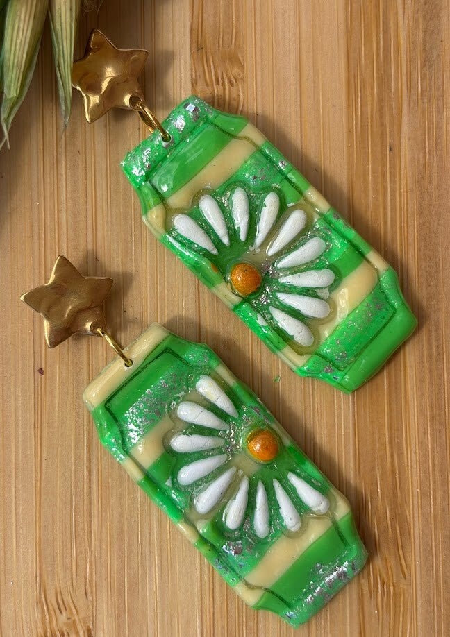 Découvrez les boucles d'oreilles Lucia ,une création unique de ma collection éveil printanier. Un design floral vibrant alliant étoile dorée en acier inoxydable et motifs printaniers pour illuminer votre style. commandez votre pièce artisanale dès maintenant !