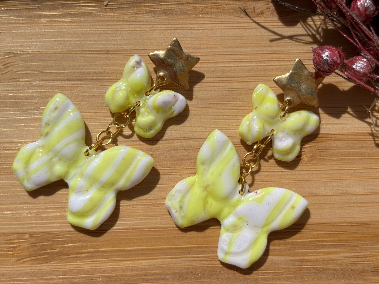 Laissez-vous charmer par la délicatesse des boucles d'oreilles Jeanne. Inspirées par la légèreté du printemps ces créations artisanales mettent à l'honneur des papillons .L'attache en acier inoxydable doré en forme d'étoile apporte une touche de magie et de raffinement supplémentaire à l'ensemble.