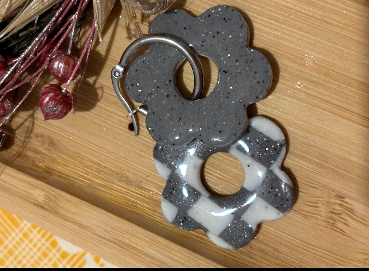 Découvrez la paire de Maéva, des boucles d'oreilles créoles avec Pampilles interchangeables daudacieuse qui jouent sur les contrastes. D'un côté, un motif à damier gris et blanc ultra tendance, et l'autre côté, un gris pailleté sophistiqué. Leur forme de fleur apporte une touche de douceur à ce bijou de caractère.