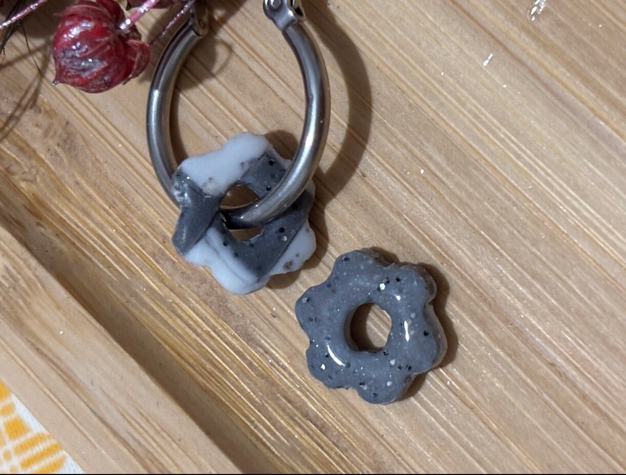 Découvrez la paire de Mini Maéva, des boucles d'oreilles créoles avec Pampilles interchangeables daudacieuse qui jouent sur les contrastes. D'un côté, un motif à damier gris et blanc ultra tendance, et l'autre côté, un gris pailleté sophistiqué. Leur forme de fleur apporte une touche de douceur à ce bijou de caractère.