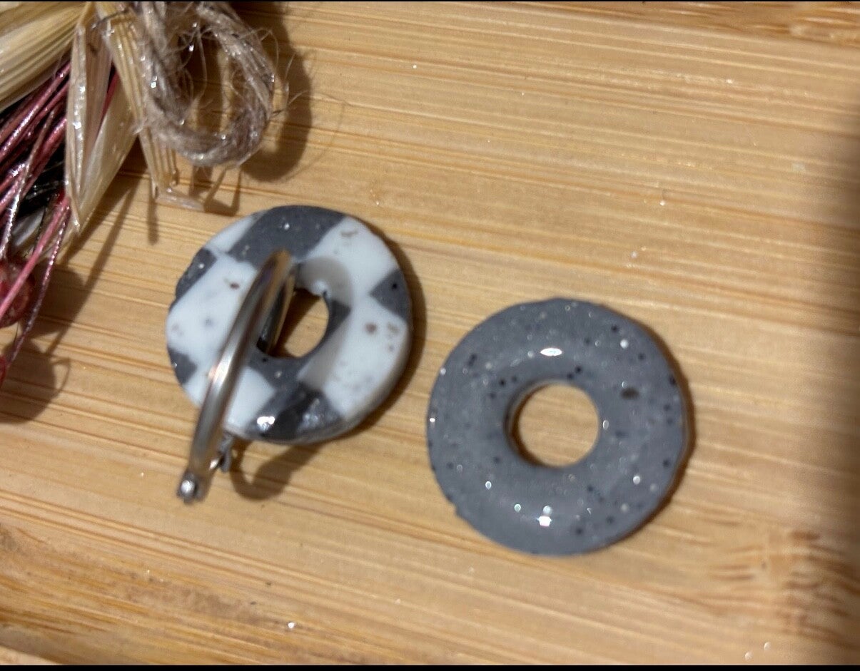 Découvrez la paire de Petite Romy , des boucles d'oreilles créoles avec Pampilles interchangeables daudacieuse qui jouent sur les contrastes. D'un côté, un motif à damier gris et blanc ultra tendance, et l'autre côté, un gris pailleté sophistiqué. Leur forme de fleur apporte une touche de douceur à ce bijou de caractère.